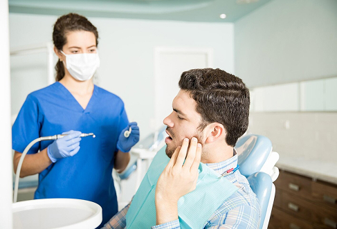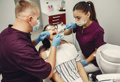 Dentist wearing gloves performs dental treatment on a patient reclining in a dental chair.